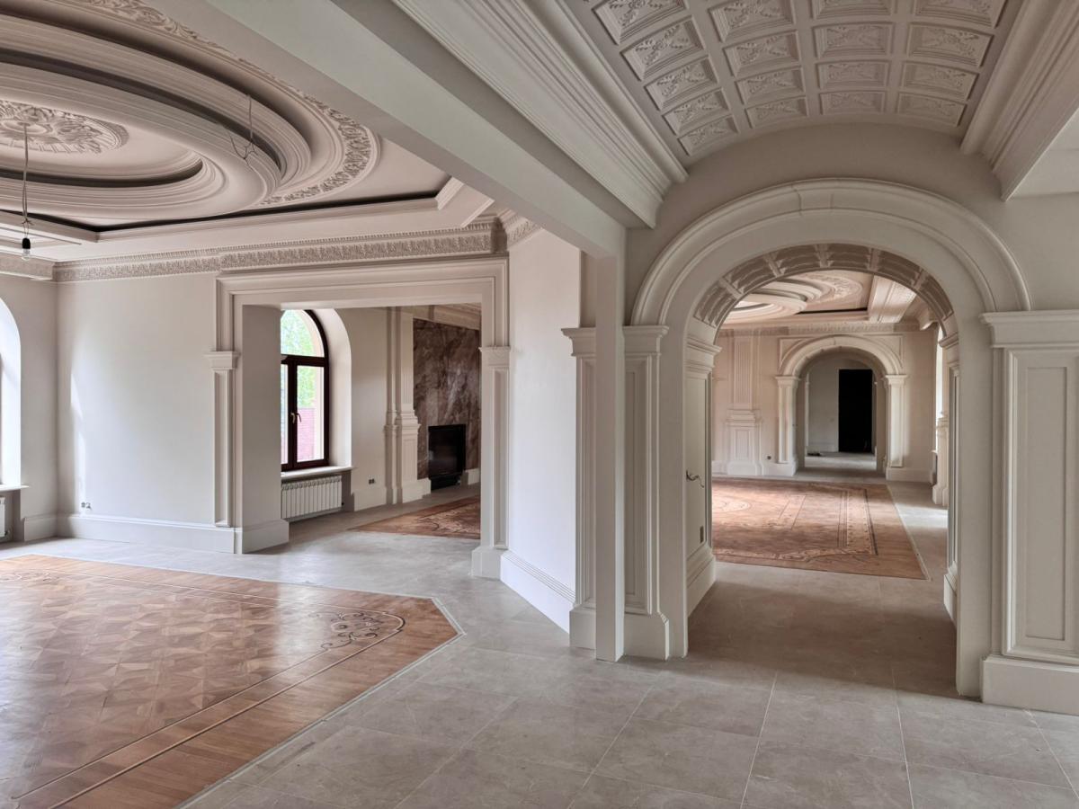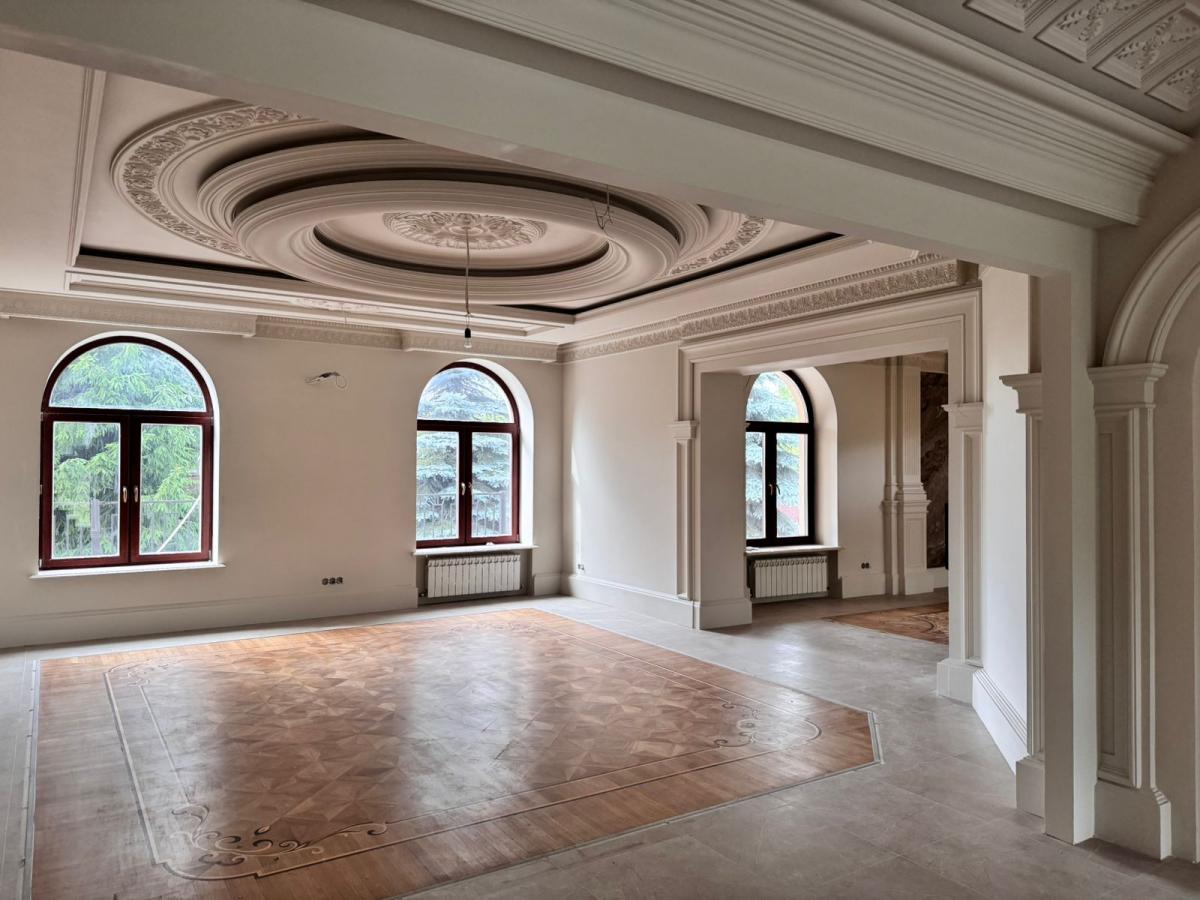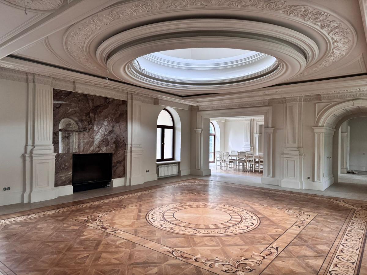 Просторные залы с камином , авторским паркетом и лепниной.