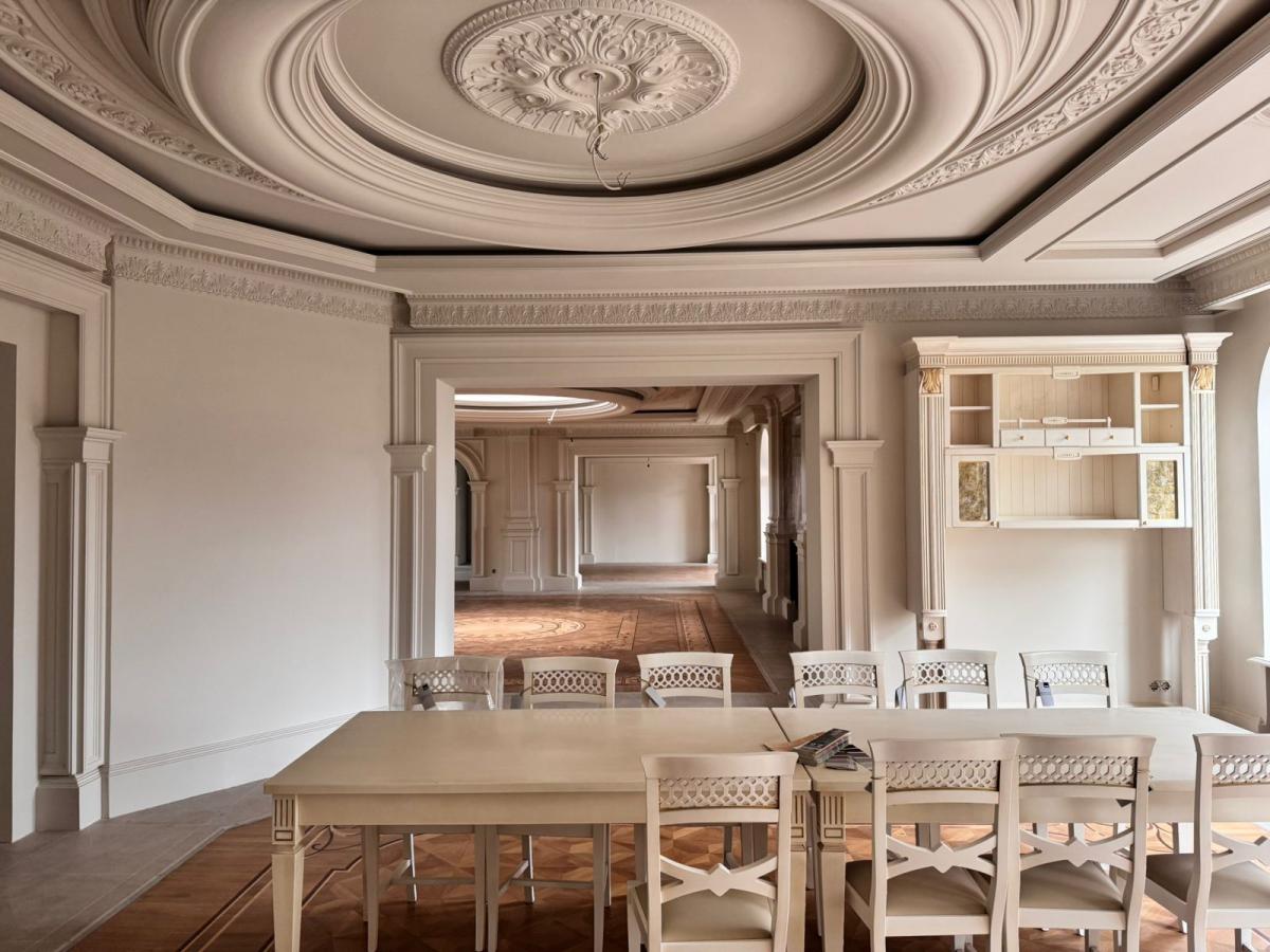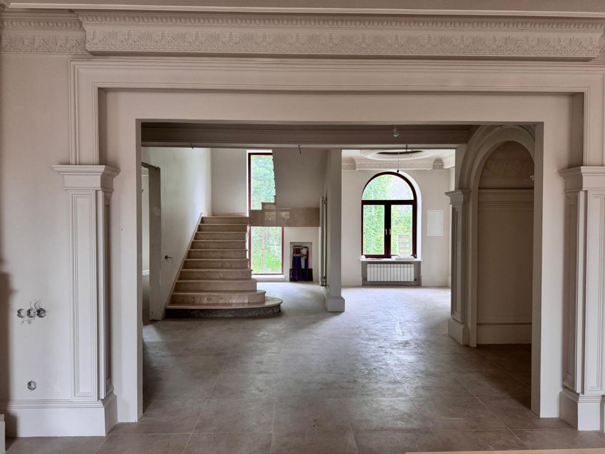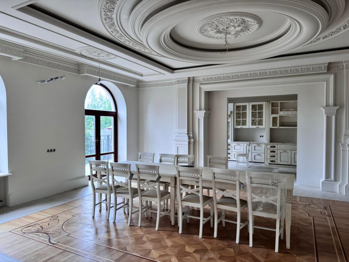 Просторные залы с камином , авторским паркетом и лепниной.