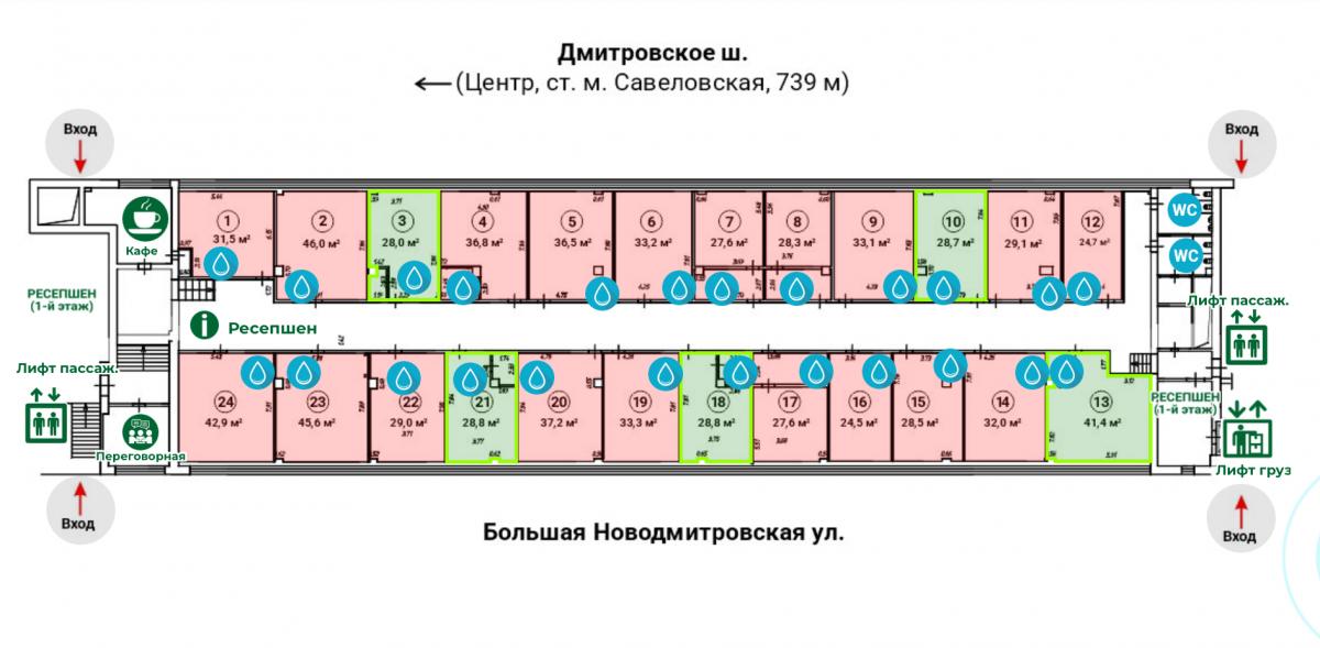 БИЗНЕС-ЦЕНТР И ЛОКАЦИЯ. Бизнес-центр расположен между станциями метро Савеловская и Дмитровская (7 минут пешком). Удобные заезды и выезды для автомобилистов на ТТК или Дмитровское шоссе. Рядом Савеловский вокзал, аэроэкспресс в Шереметьево, МЦД (D1). Развитый деловой район. В пешей доступности арт-пространства, магазины, парки, рестораны. Входы в БЦ со стороны Бутырской и Большой Новодмитровской улиц. Ресепшн. Пассажирские и грузовые лифты. Возможна парковка на внутренней территории.