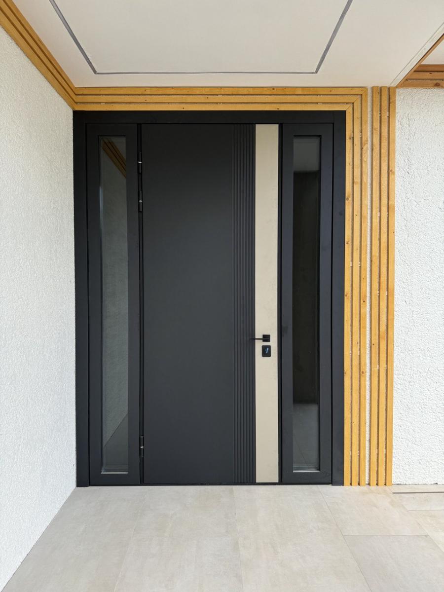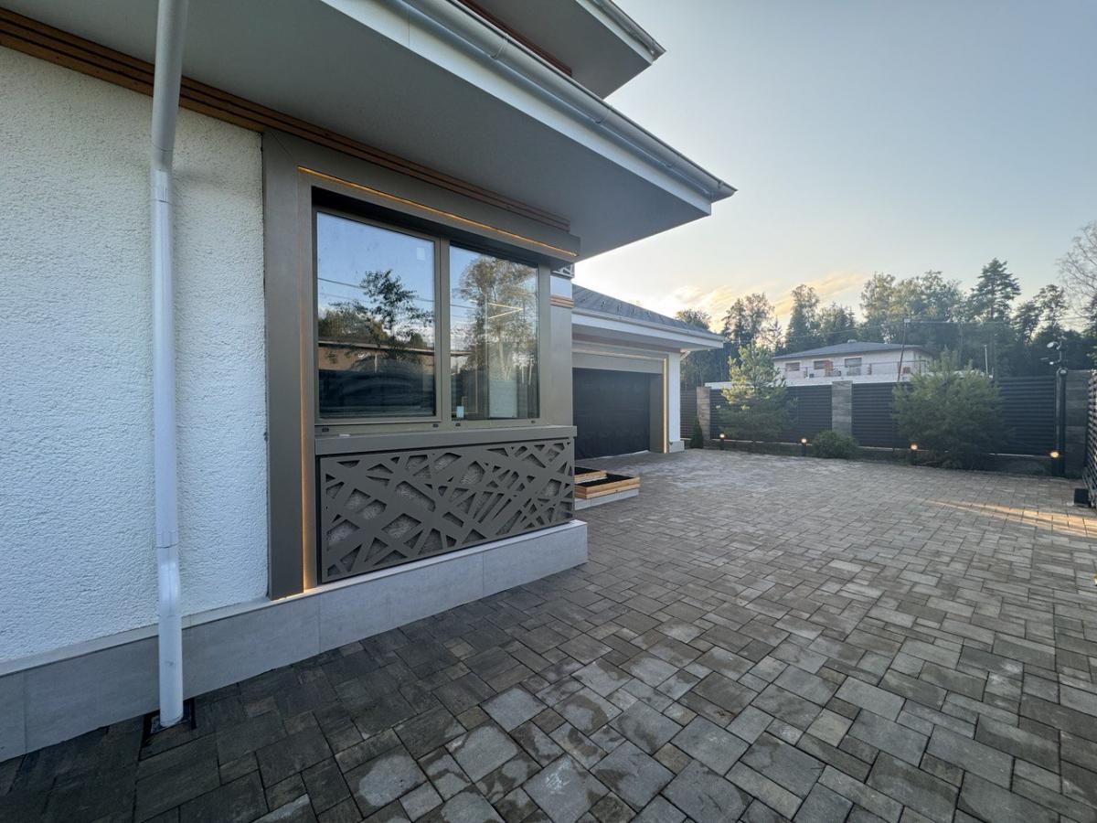 Каркас дома монолитный, перекрытия монолитные, перегородки из газобетонного блока. Фундамент - монолитная плита с ребрами жесткости. Предусмотрена чистовая отделка по дизайн-проекту. Внешняя отделка из перлитовой штукатурки, деревянных реек, крупноформатного керамогранита. Многоскатная крыша из мягкой черепицы. Цоколь облицован керамогранитом. Покрытие террасы - террасная доска мпк и крупноформатный керамогранит. Остекление - теплый алюминиевый профиль.