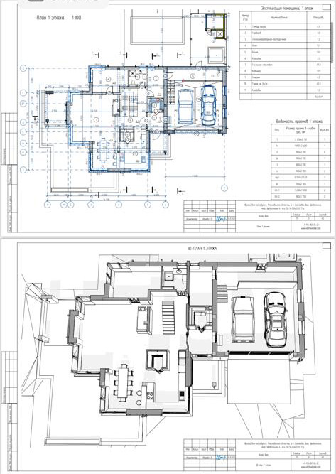 -1 этаж: кухня, гостиная-столовая, кабинет/спальня, санузел, подсобные помещения, гараж на 2 автомобиля;