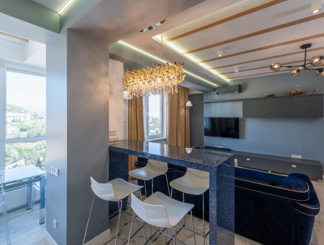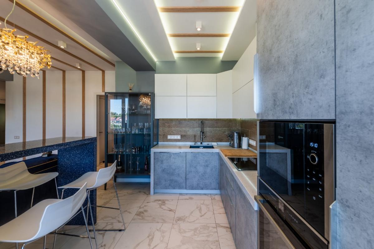Кухня-гостиная: столешница кварц, барная стойка, бытовая техника премиум-класса NEFF.