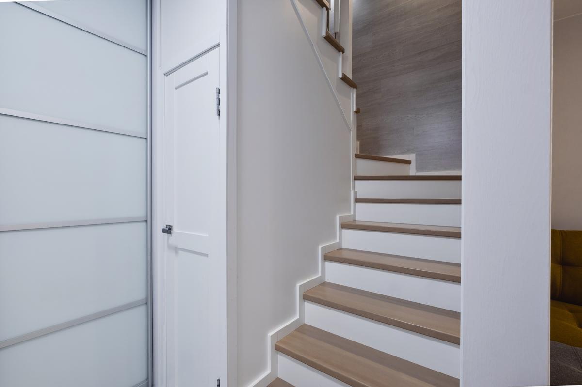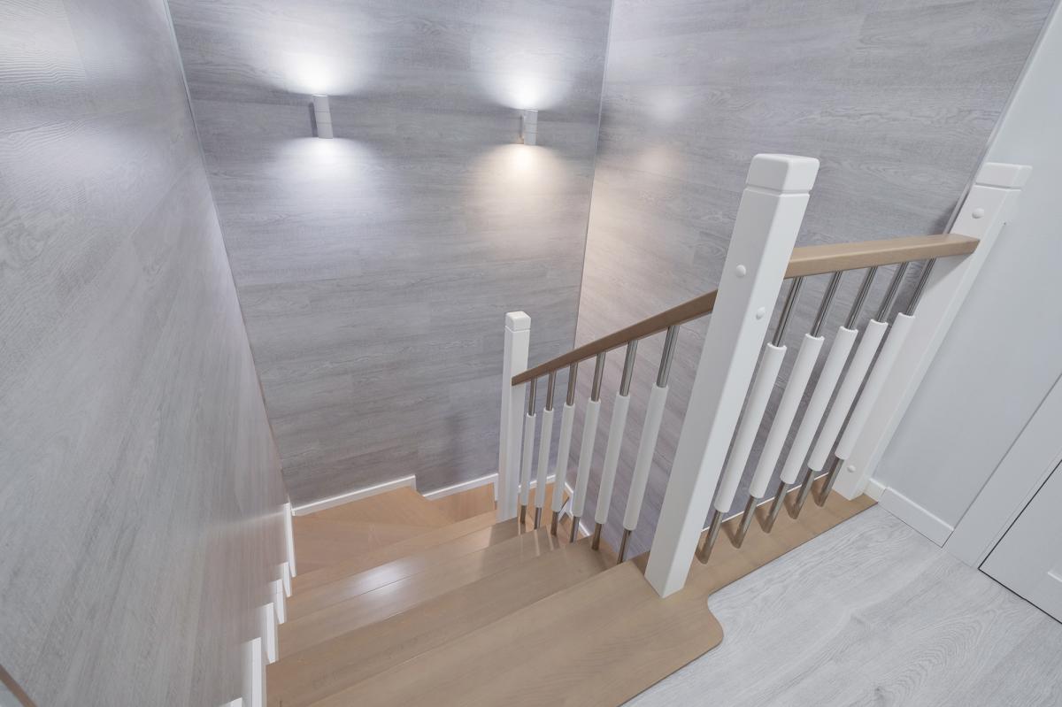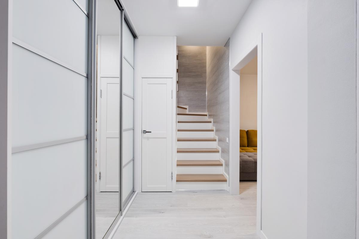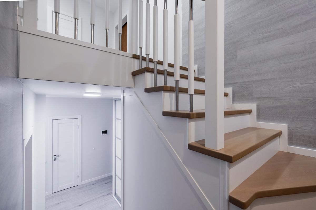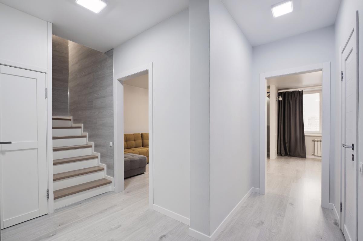 В квартире на первом уровне расположены просторные кухня и гостиная, санузел, постирочная, в месте под лестницей размещена гардеробная.
