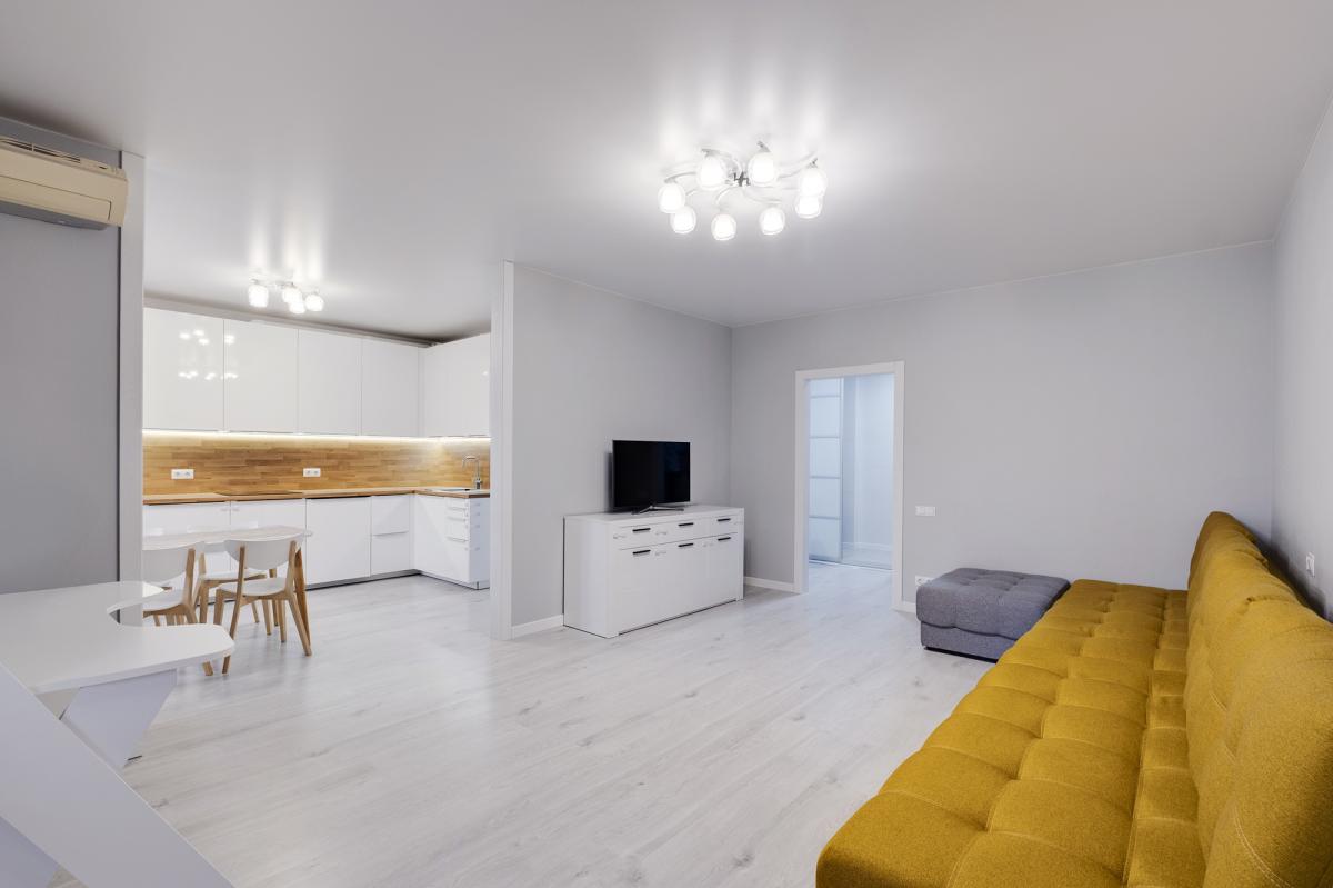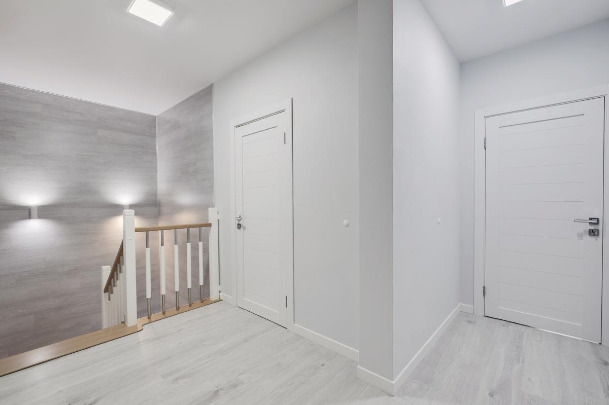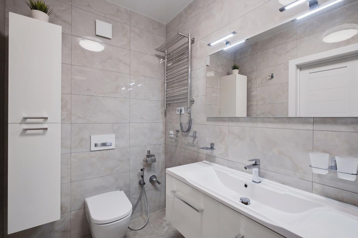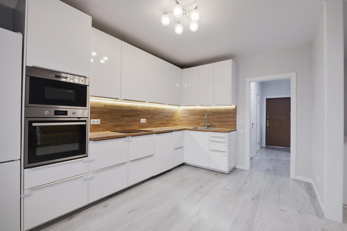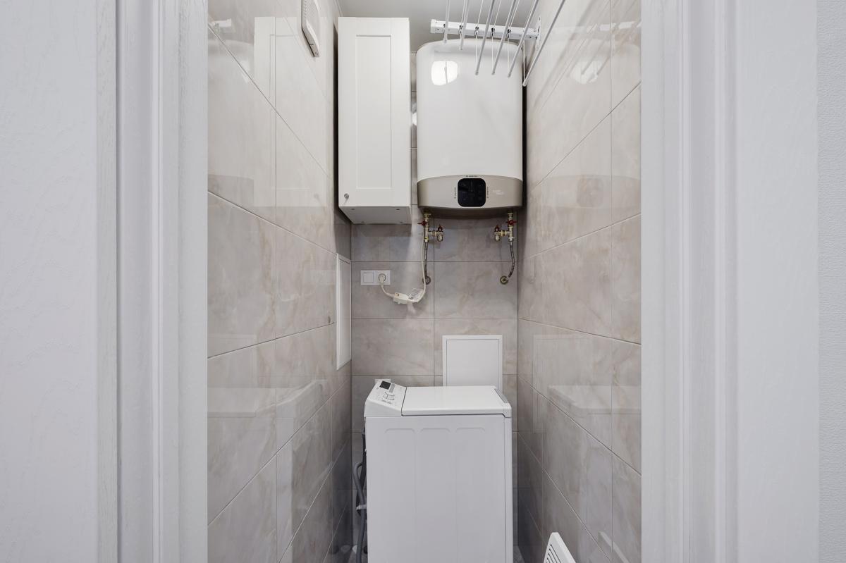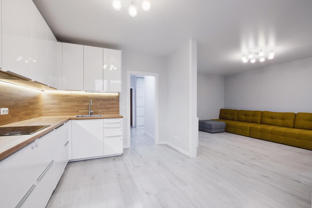 В квартире на первом уровне расположены просторные кухня и гостиная, санузел, постирочная, в месте под лестницей размещена гардеробная.