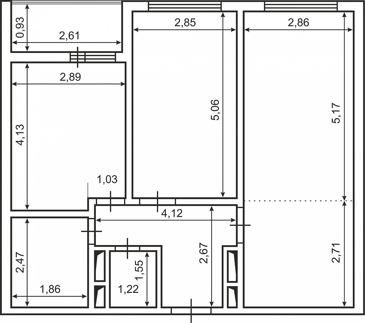 Функциональная планировка в формате евро три, с двумя санузлами, возможностью переноса кухни и разделением на три отдельных комнаты.