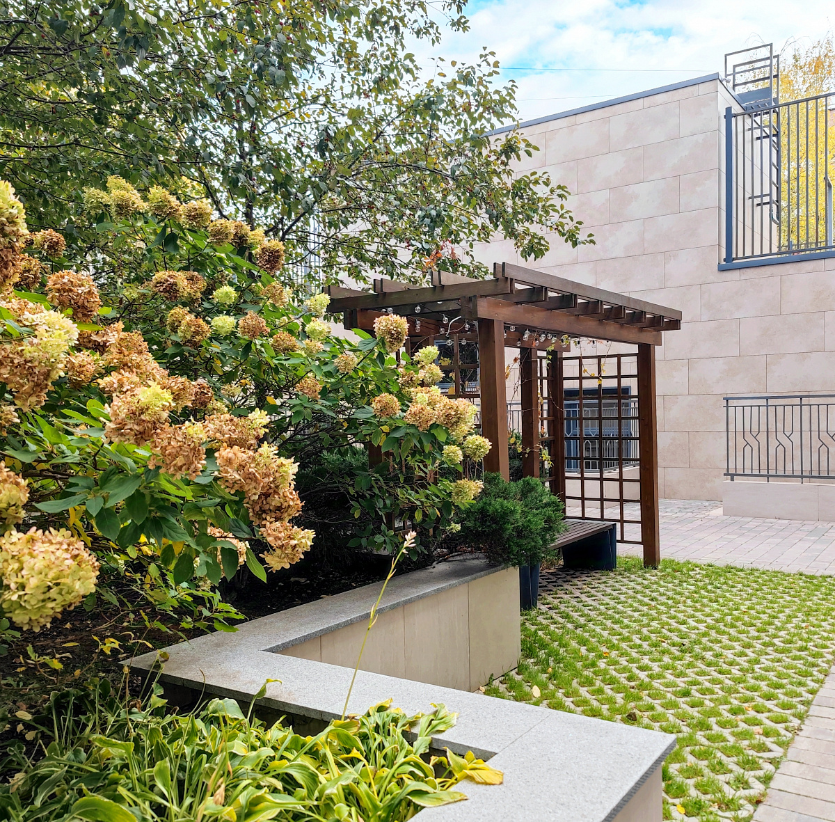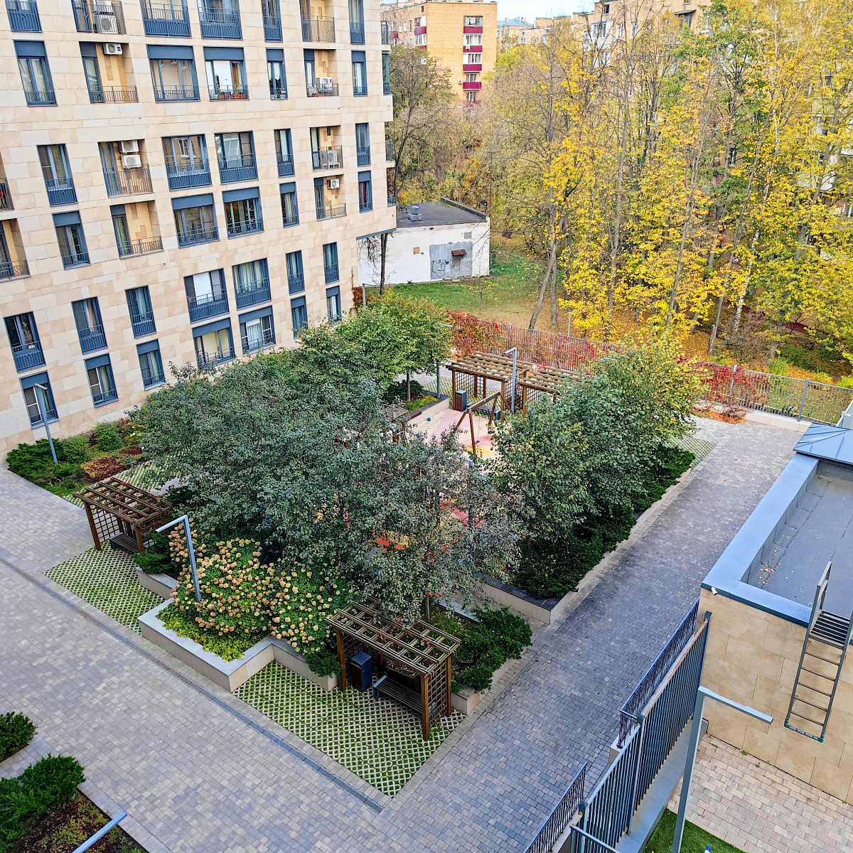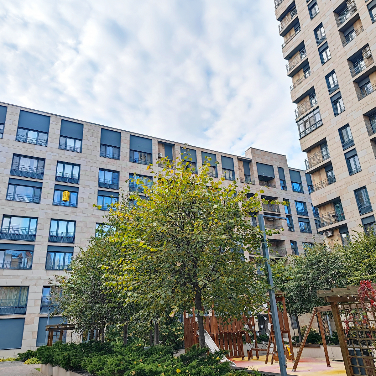 В клубном доме реализована концепция закрытого, охраняемого двора, где расположены зоны отдыха и детские площадки. Территория комплекса приподнята над уровнем земли, что делает пространство еще более приватным и безопасным.