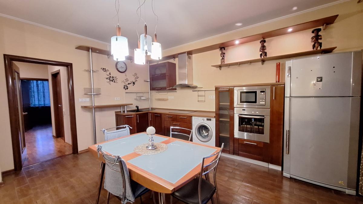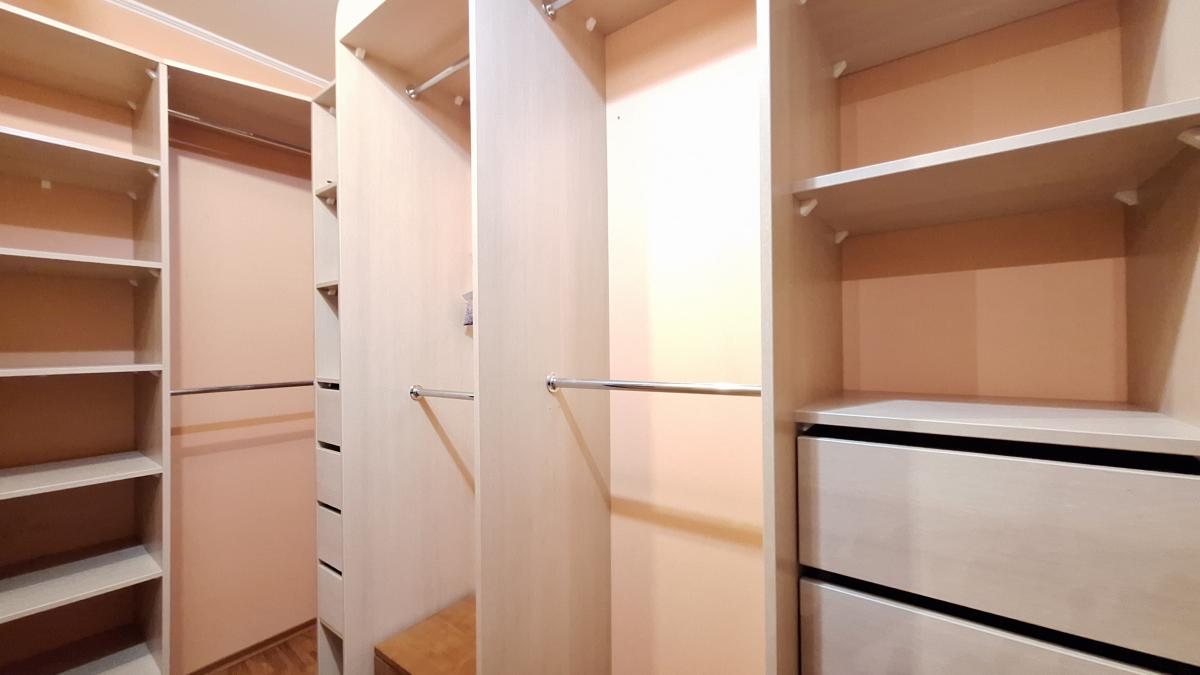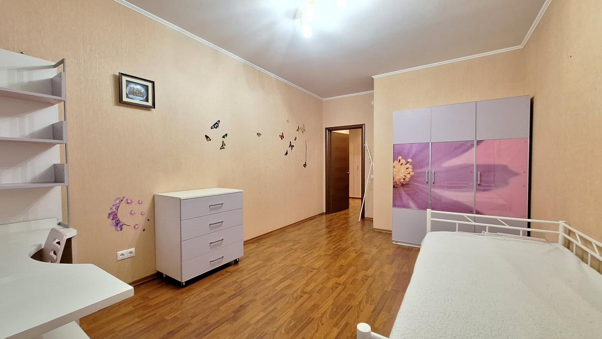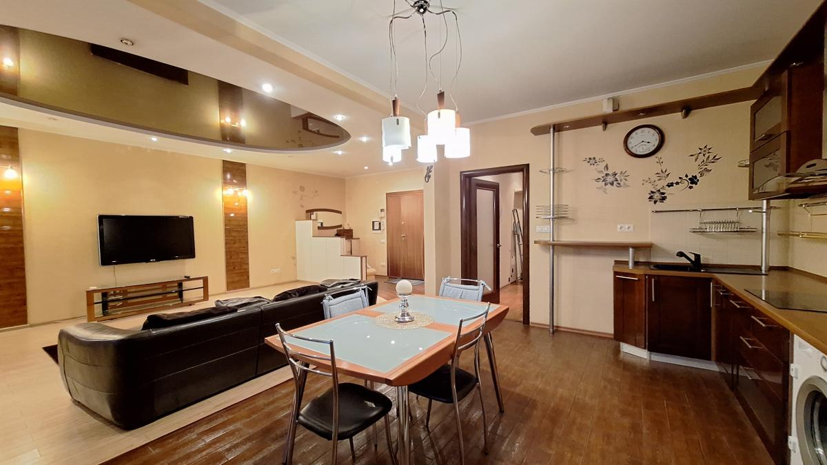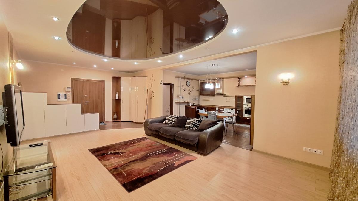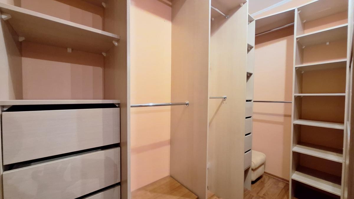 Квартира с функциональной планировкой: кухня-гостиная с двумя большими остекленными балконами, два санузла, две изолированных комнаты, одна из которых с вместительной гардеробной. Приватная зона отделена от гостиной.