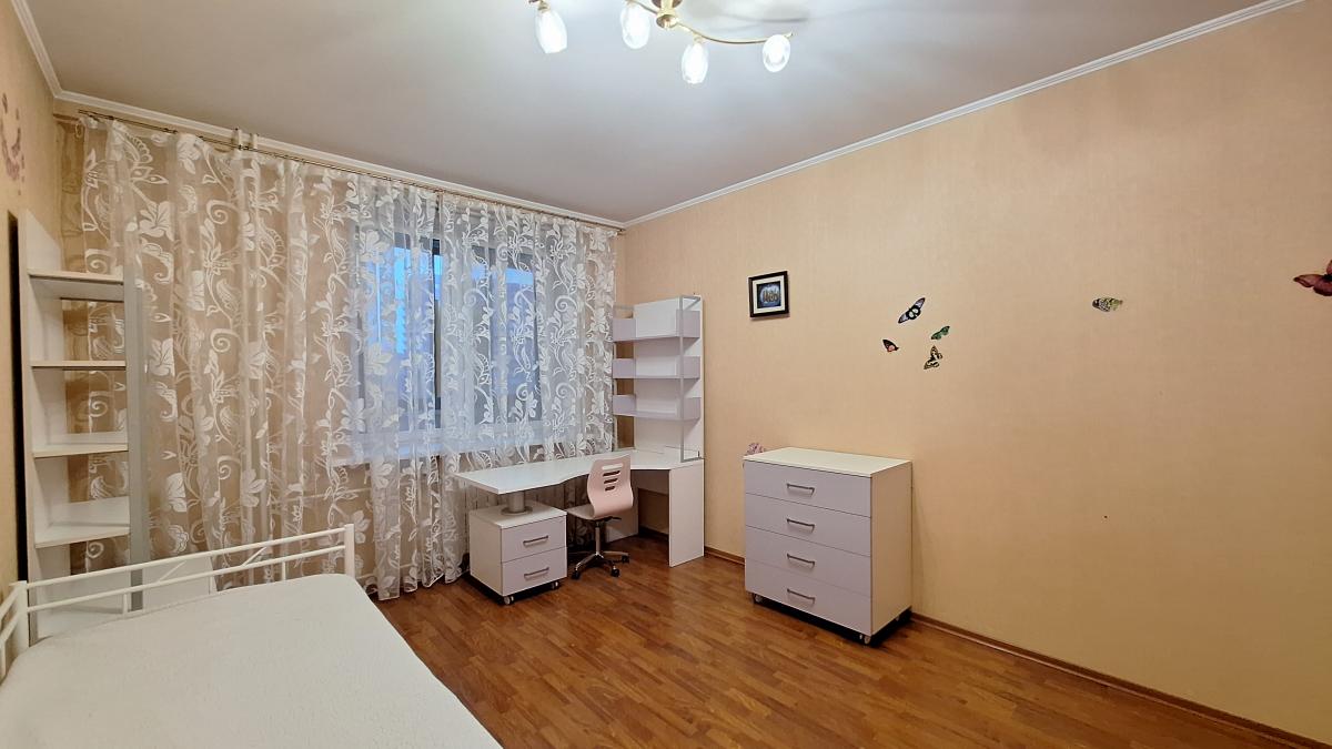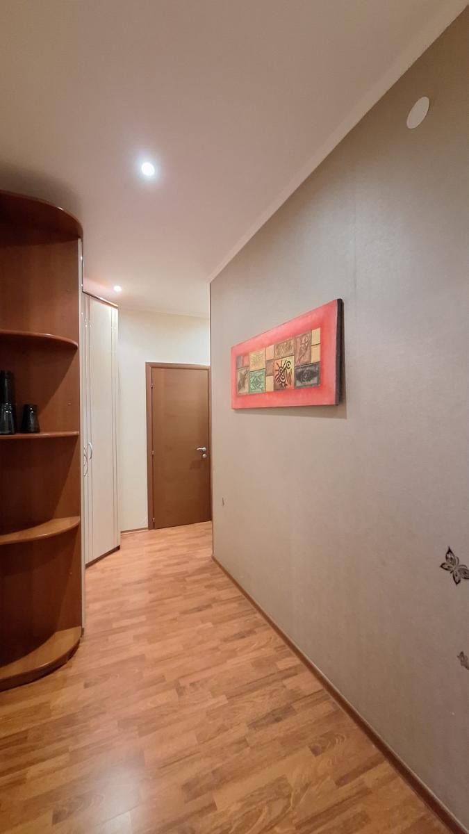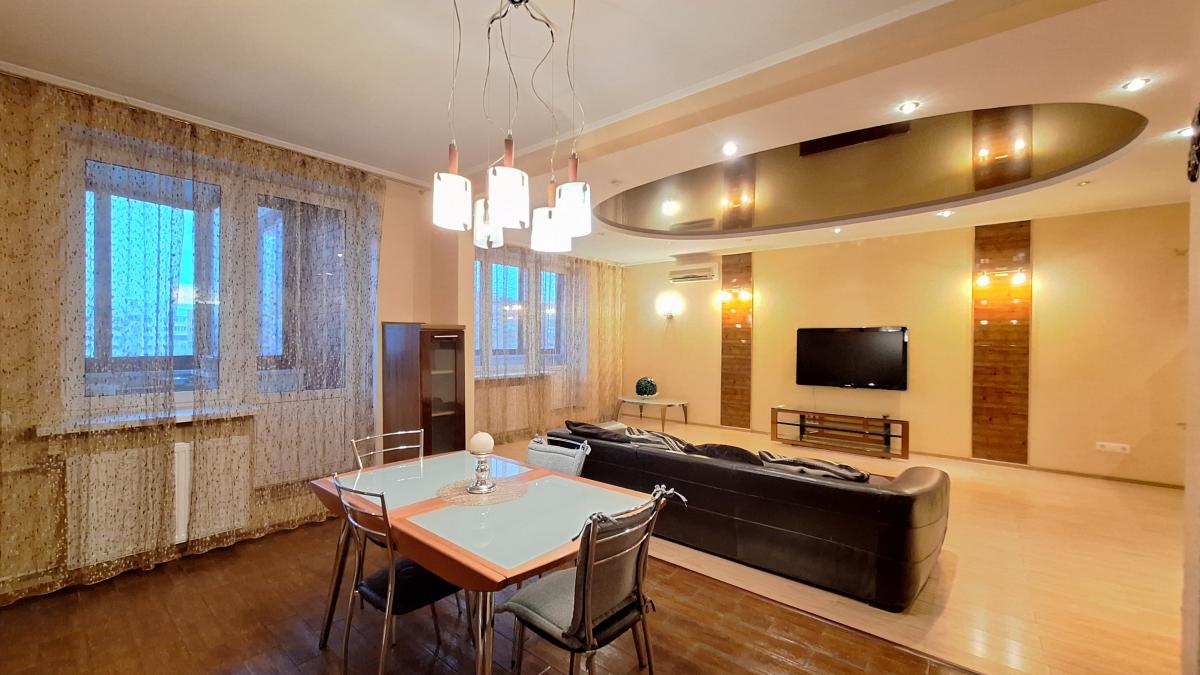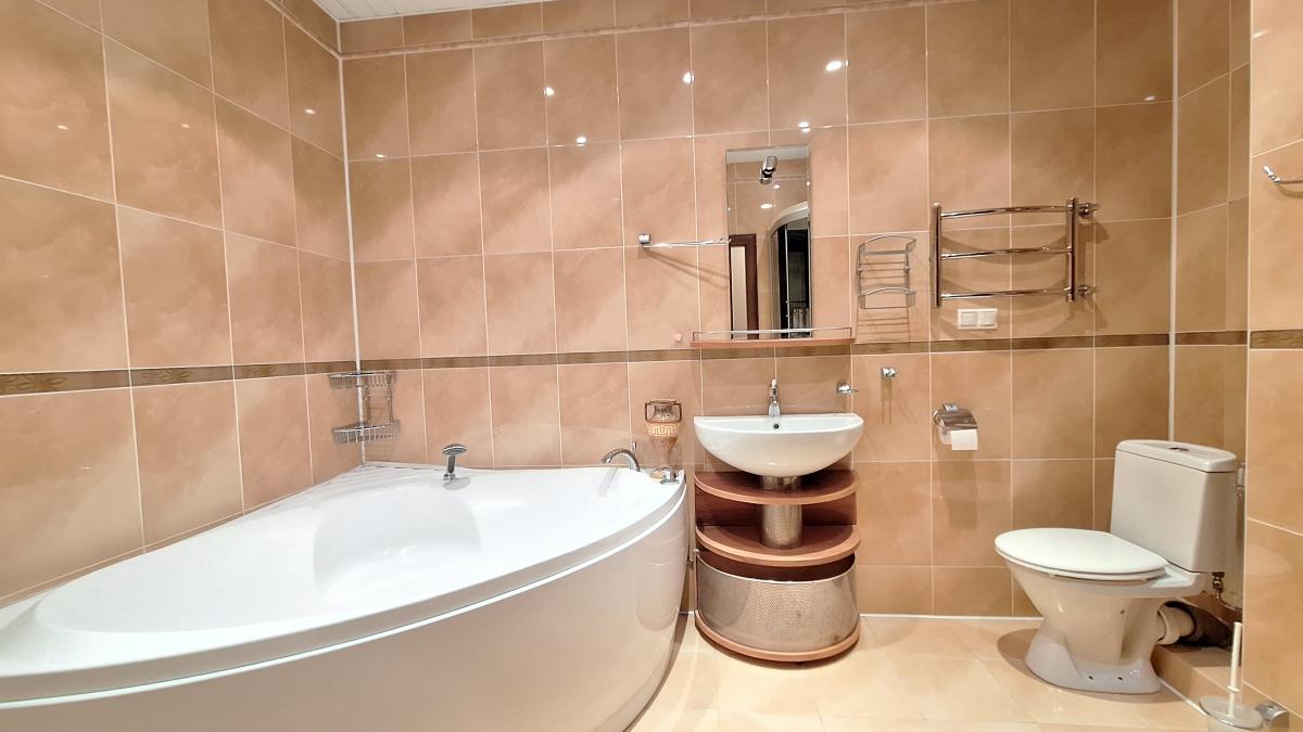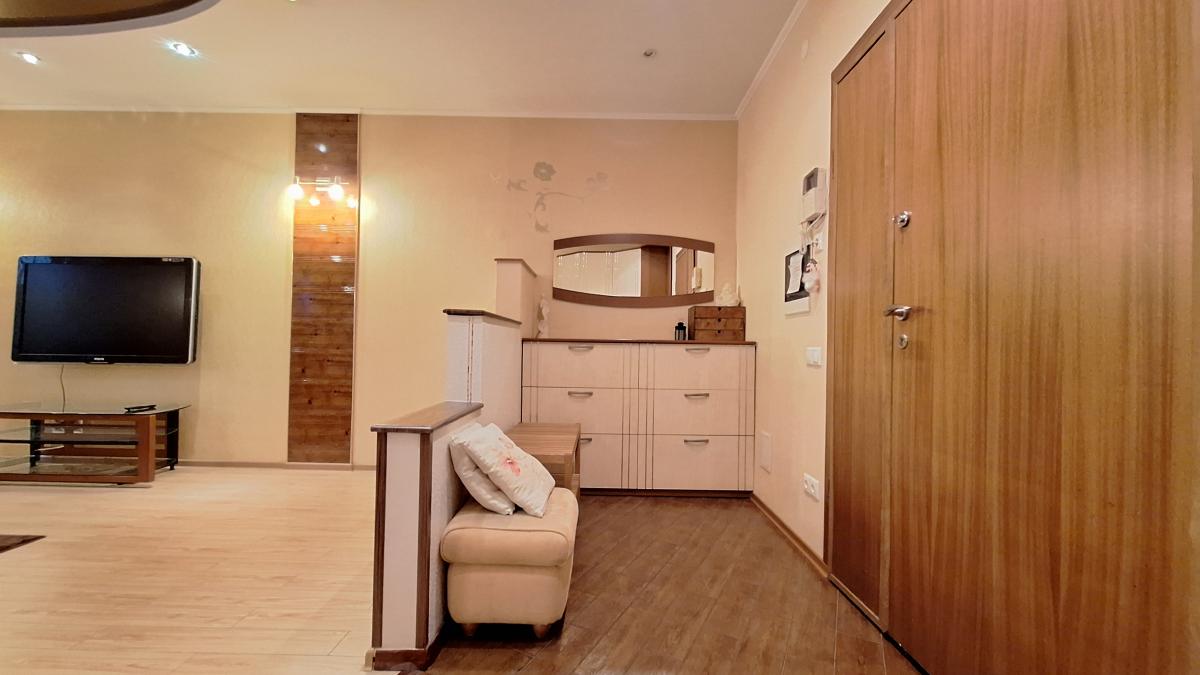 Квартира с функциональной планировкой: кухня-гостиная с двумя большими остекленными балконами, два санузла, две изолированных комнаты, одна из которых с вместительной гардеробной. Приватная зона отделена от гостиной.