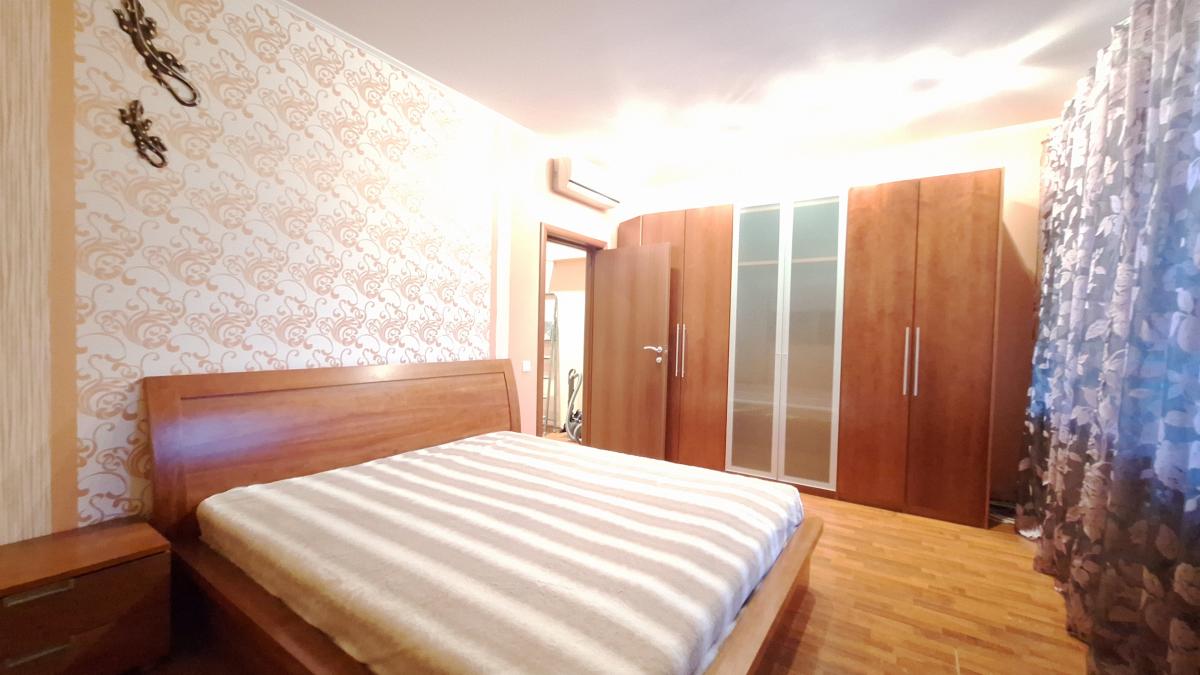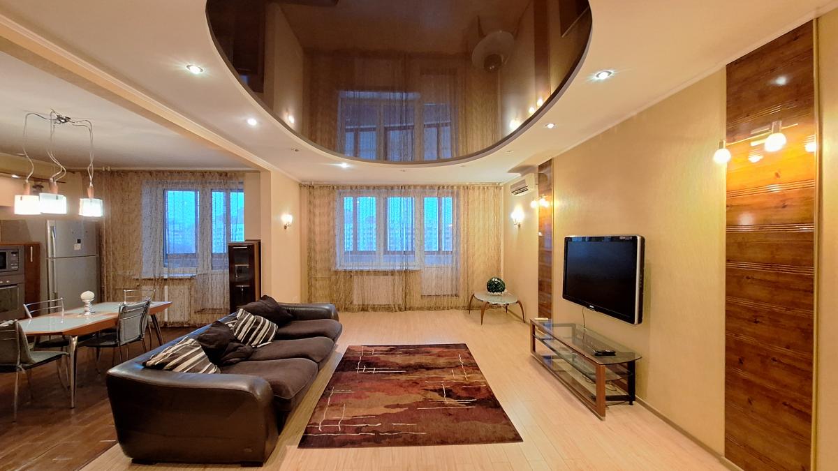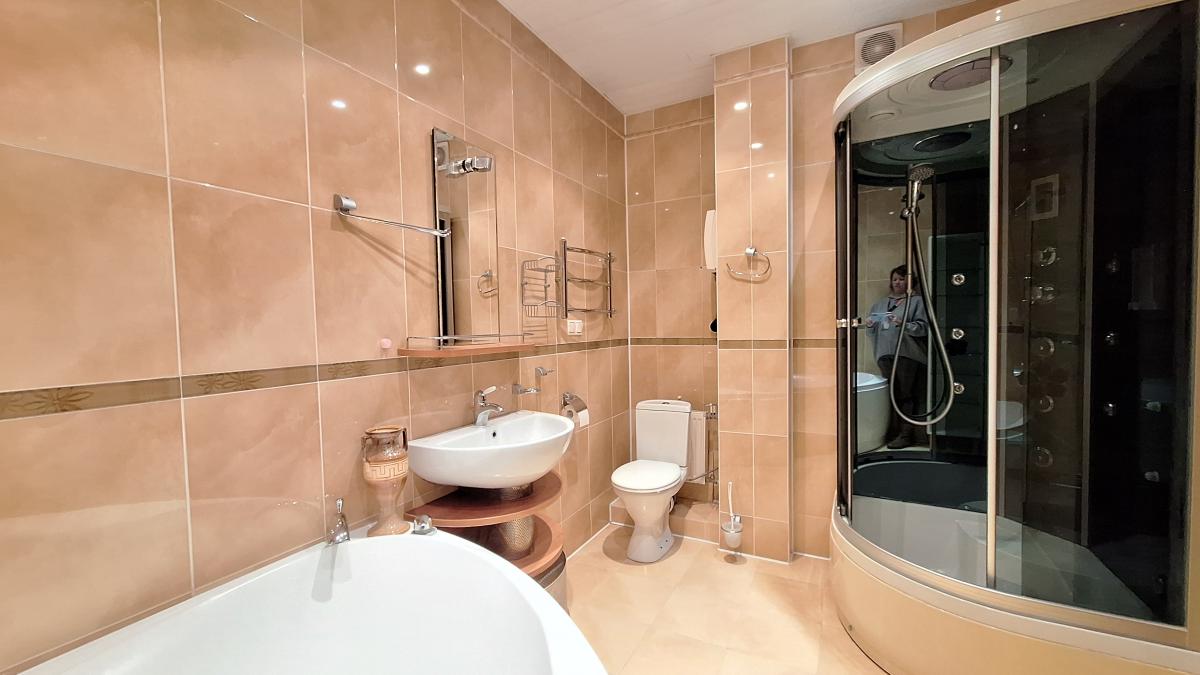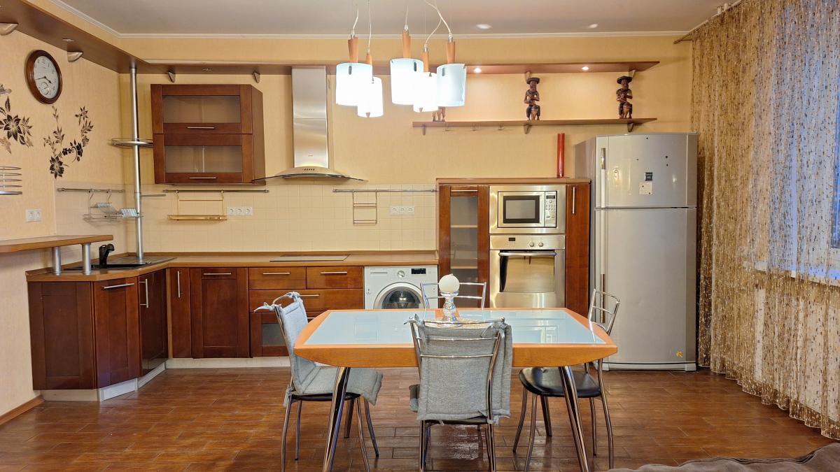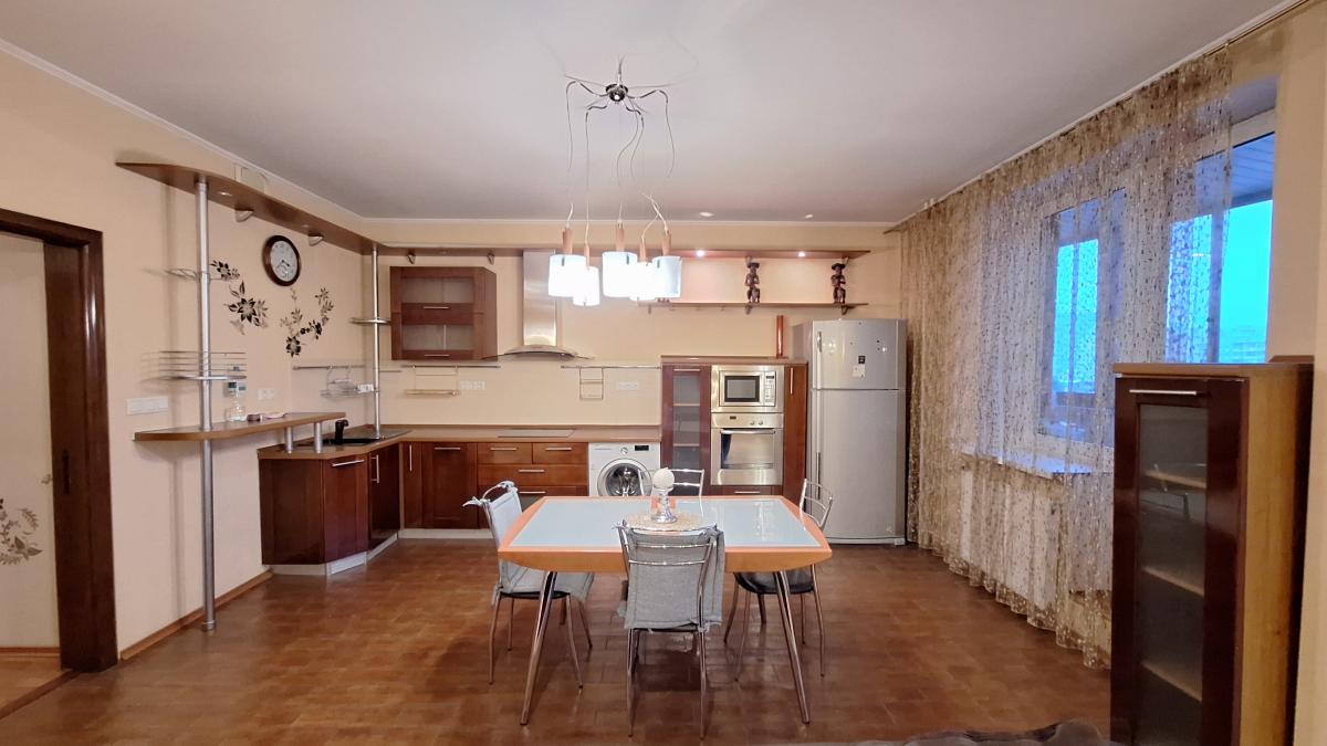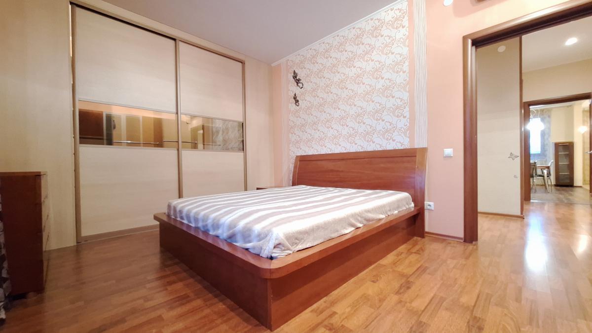 Квартира с функциональной планировкой: кухня-гостиная с двумя большими остекленными балконами, два санузла, две изолированных комнаты, одна из которых с вместительной гардеробной. Приватная зона отделена от гостиной.