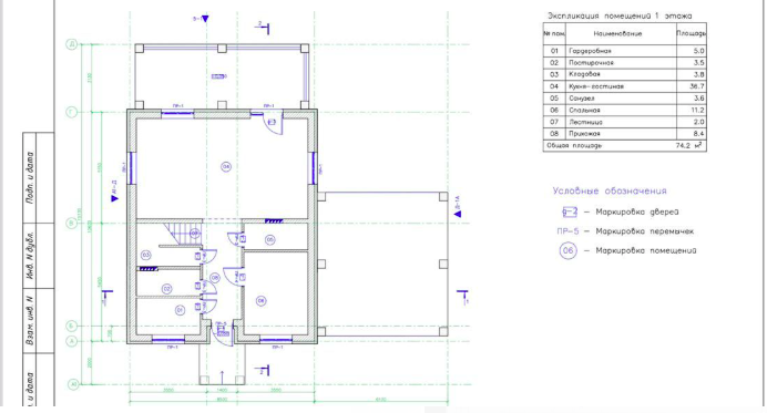 1 этаж - большая гостиная с кухней 36,7 м2, спальня 11,2 м2; санузел, постирочная, котельная, кладовка.