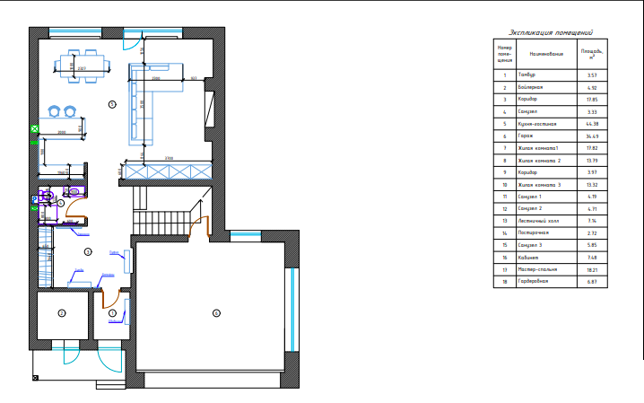 1 этаж: Просторная прихожая, Кухня-гостиная с дровяным камином, С/У, Гараж (при желании позволяет сделать дополнительную комнату, спортзал или кинотеатр), котельная.