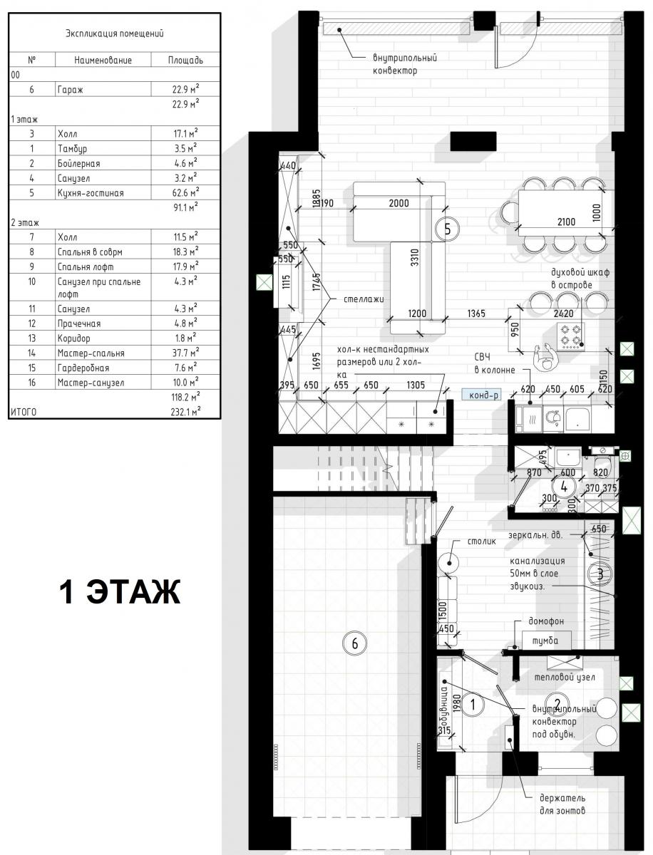 1 этаж: Просторная прихожая, Кухня-гостиная с дровяным камином, С/У, Гараж (при желании позволяет сделать дополнительную комнату, спортзал или кинотеатр), котельная.
